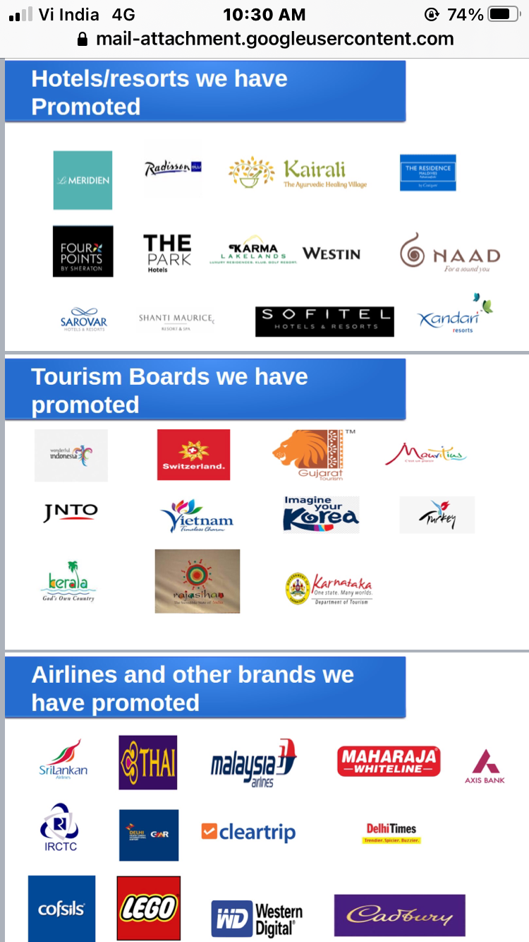 We provide social media branding /visibility to brands in the travel, food, hospitality and parenting space. We have worked with many premium brands like Switzerland Tourism, Indonesia , Mauritius , Le Meridien, Sarovar Hotels, Radisson Blu, Sofitel Imperial, Srilankan Airlines , Cadbury’s, Lego, Western Digital and many more across the world.
